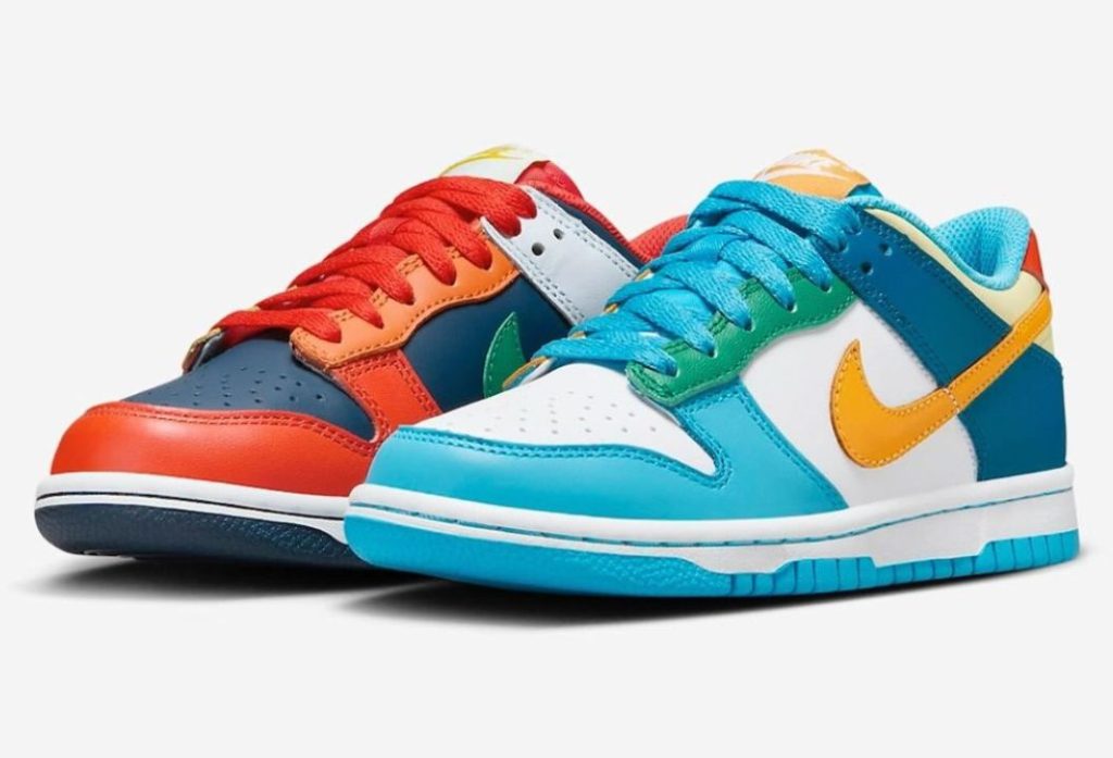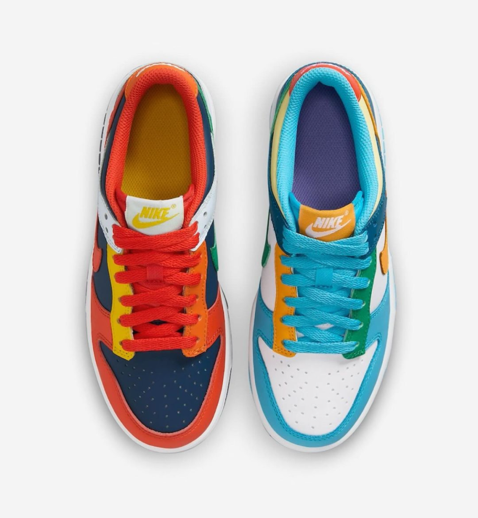 Esta versión exclusiva para niños de “What The” Dunk Low, muestra una vibrante paleta multicolor, que combina varios tonos como azul, dorado universitario, naranja, rojo, azul marino, verde y blanco.